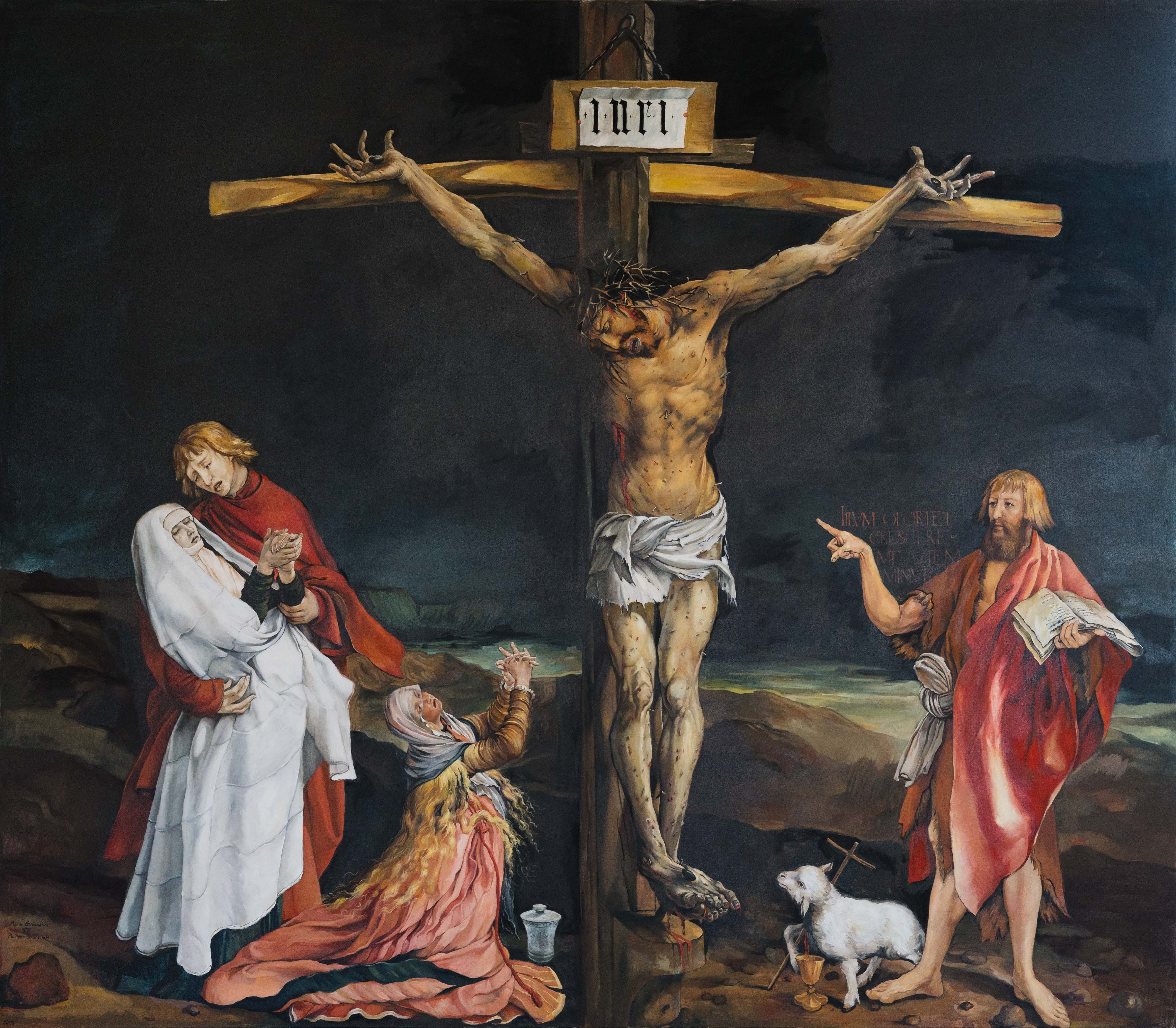 The people to the left of Christ are commonly included in Crucifixion imagery: John the Evangelist holds and comforts Mary, mother of Jesus, and Mary Magdalene kneels and mourns near the foot of the cross. Unusually, however, Grünewald includes John the Baptist (who died years before the crucifixion) to the right of Christ. The Latin inscription in the crook of his arm, Illum oportet crescere me autem minui, is the Vulgate translation of John 3:30: “He must increase; I must decrease.” Karl Barth, who kept a reproduction of this image over his writing desk for fifty years, repeatedly drew attention to this figure: “Witnessing means pointing in a specific direction beyond the self and on to another... In this connection one might recall John the Baptist in Grünewald’s Crucifixion, especially his prodigious index finger. Could anyone point away from himself more impressively and completely?” (Church Dogmatics I/1, 111–12).