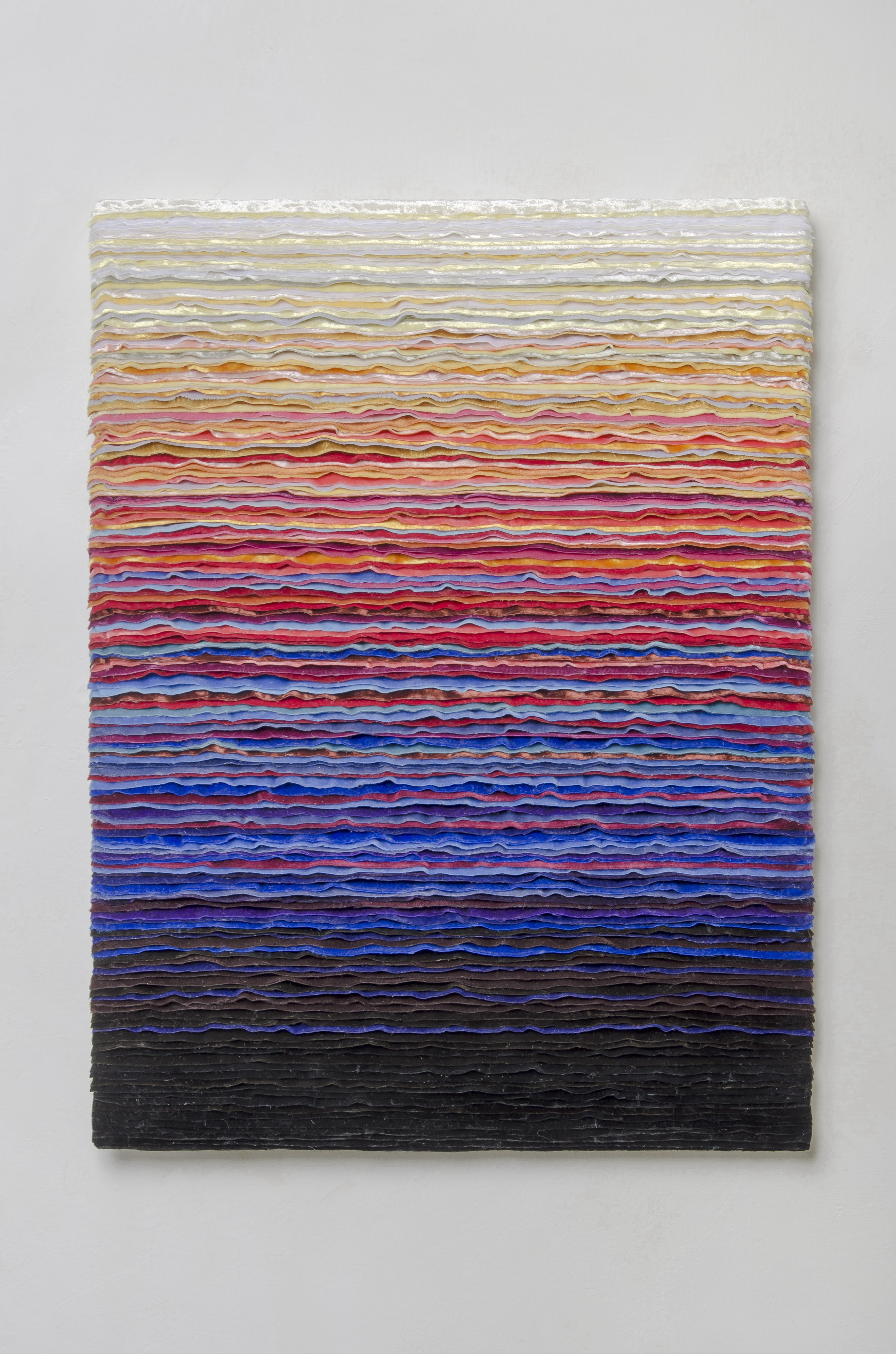 "This work is from a series of simulated abstract paintings constructed from strips of cut velvet adhered to a wood panel. Not actually using paint, the varied colours I discover and purchase in the Los Angeles Fabric District become my palette. From darkest to palest, the blue, red, and yellow hues and shades are arranged to move upward toward the light, perhaps forming a revelation. Simple and repetitive labour by hand, in real time and space, is recorded in the resulting object, intended for contemplation by a viewer, not on a screen but standing before it." —Lynn Aldrich