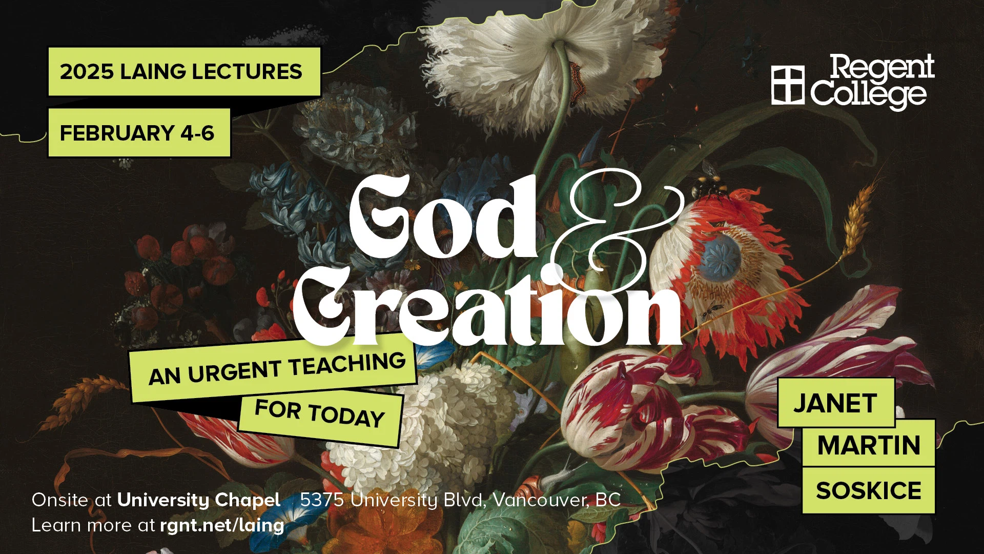 The Laing Lectures began at Regent College in 1999 in cooperation with Roger and Carol Laing and in honour of their father, William John Laing. The purpose of the lectures is to encourage persons recognized for scholarship, wisdom, and creativity to undertake serious thought and original writing on an issue of significance for the Christian church and to promote the sharing of such thoughts through a series of public lectures.